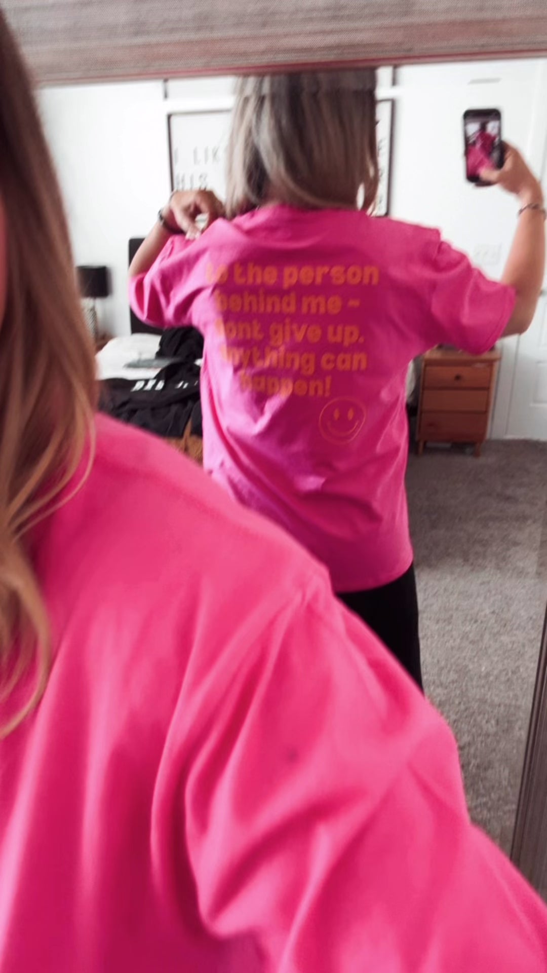 "LET IT BE, BESTIE" is on the front, with "TO THE PERSON BEHIND ME - DON'T GIVE UP. ANYTHING CAN HAPPEN!" printed on the back!